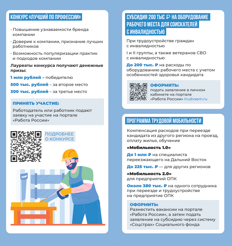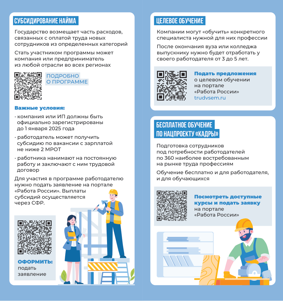 Министерство труда и социальной защиты Донецкой Народной Республики информирует о мерах поддержки в сфере занятости и мероприятиях, реализуемых в рамках национального проекта «Кадры» федерального проекта «Активные меры содействия занятости».